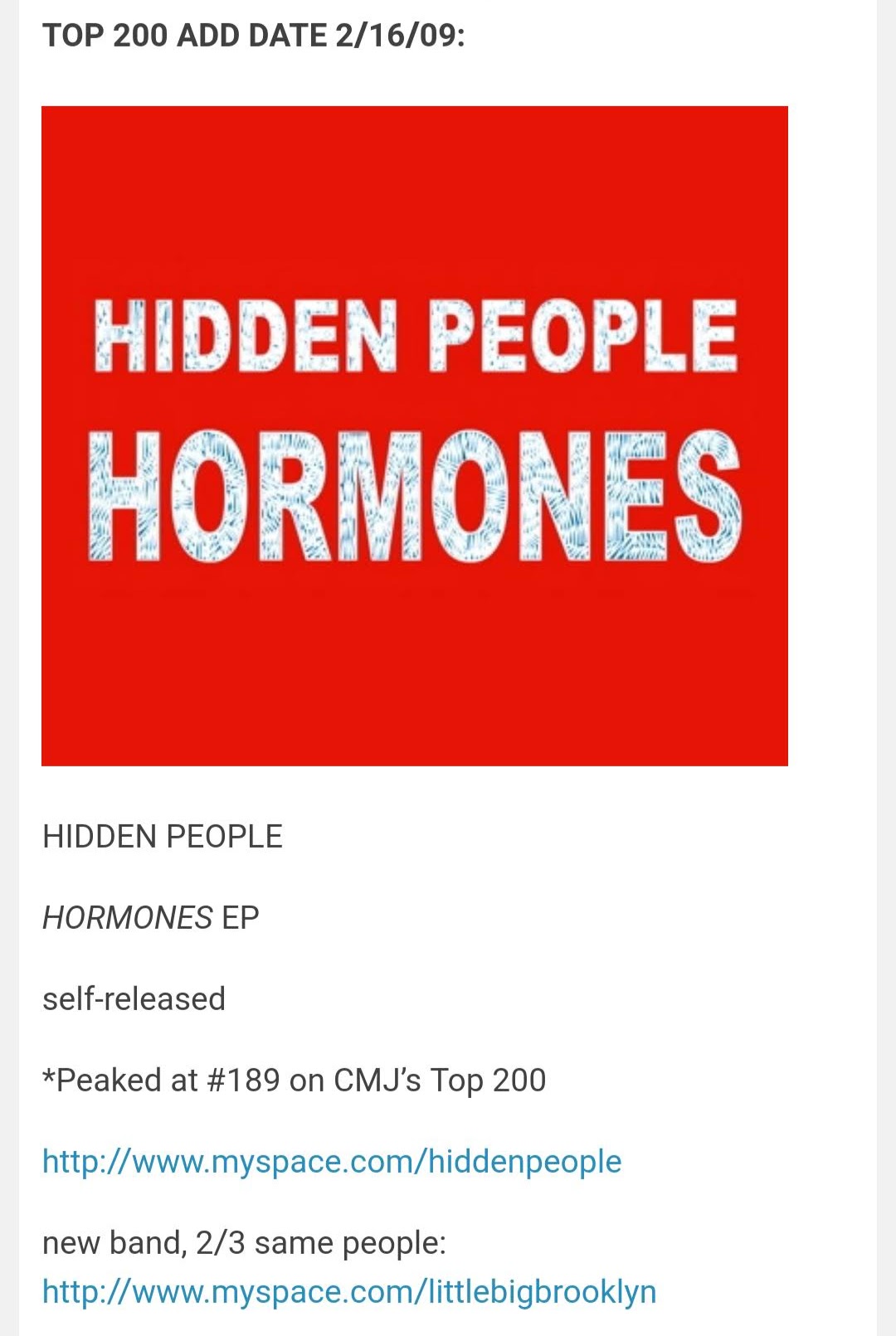 I’ll never forget to be grateful to Chuck Meyer and Dana Young for pushing me into really going for it in a pivotal moment – their Hidden People “Hormones” EP was my very first add, beginning its campaign for the CMJ charts ten years ago now to the day. (RIP [kinda] CMJ. And this band’s main website was a MYSPACE! Told you it was ten years ago.)